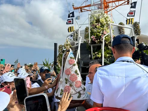 O vice-almirante Adriano Marcelino Batista, comandante do 4º Distrito Naval, expressou sua emoção por participar pela primeira vez da Romaria Fluvial e destacou a participação recorde de quase 300 embarcações, o que exigiu rigor na segurança. Imagem peregrina se aproxima do Complexo Turístico Ver-o-Rio, em Belém. — Foto: Antenor Filho/ TV Liberal Após a chegada, a imagem peregrina foi retirada do navio para ser conduzida até a Estação das Docas, onde recebeu honras de chefe de Estado, conforme a legislação estadual que declara Nossa Senhora de Nazaré padroeira do Pará e rainha da Amazônia. Em seguida, foi iniciada a Moto Romaria, a quinta procissão do Círio, com centenas de motos seguindo da Avenida Presidente Vargas até a Avenida Nazaré.No colégio Gentil Bittencourt, a imagem foi colocada em altar para a missa das 17h e posterior início da Trasladação, aguardada por mais de 1 milhão de pessoas nas ruas de Belém. O turista de Brasília Paulo Roberto Carvalho, teólogo, emocionado, destacou o fervor da festa: "É muito belo ver a fé das pessoas, a devoção católica, a hiperdulia a Nossa Senhora, venerada com sacrifício e amor tanto pela via fluvial quanto terrestre." O Círio de Nazaré, celebrado há 232 anos, é a maior manifestação católica do Brasil em termos de participação de fiéis ao longo das procissões oficiais.