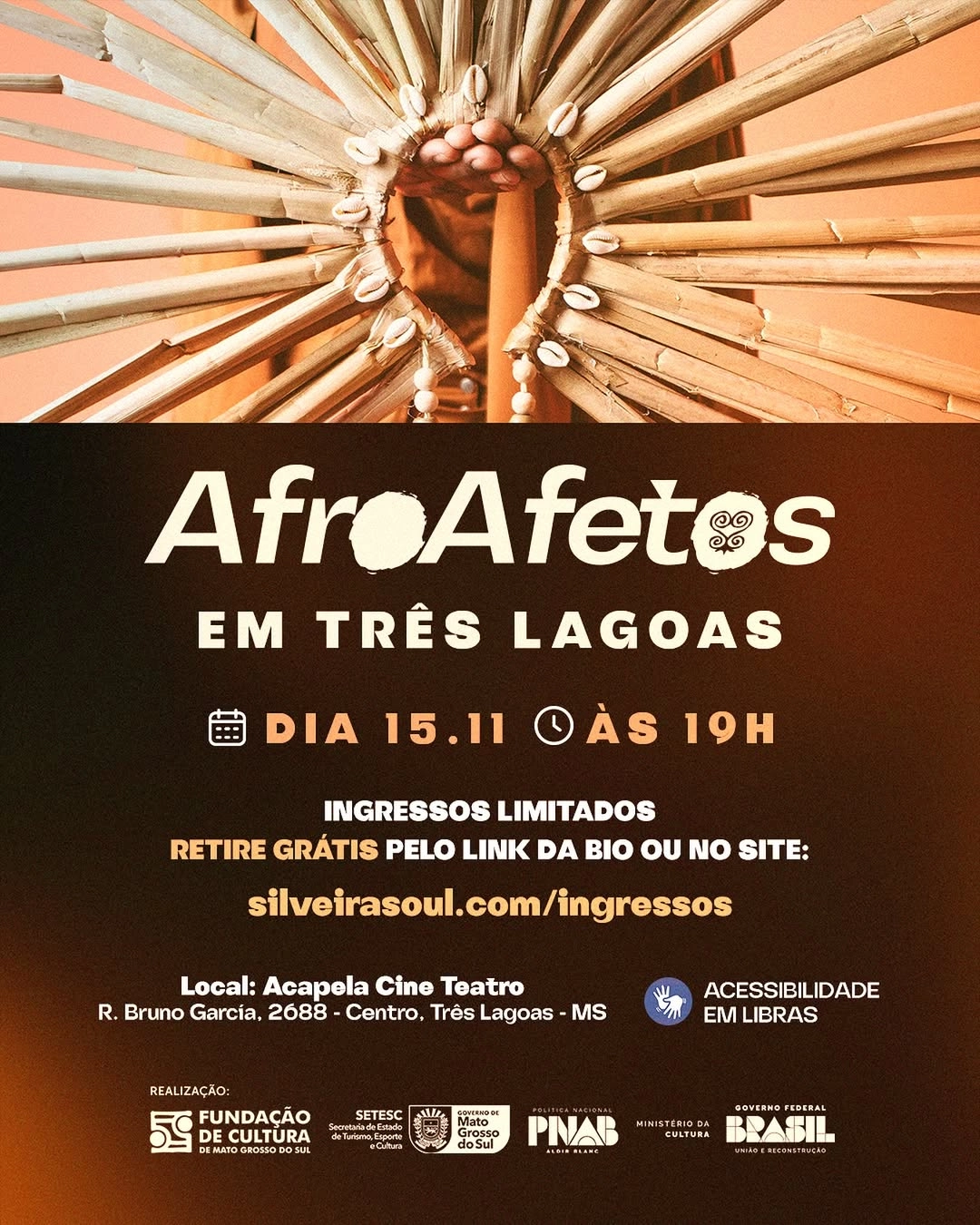 O cantor corumbaense Silveira apresenta pela primeira vez em Três Lagoas o espetáculo musical AfroAfetos, no dia 15 de novembro de 2025, às 19h, no Acapela Cineteatro (Rua Bruno García, 2688 – Centro). A entrada é gratuita, com ingressos limitados disponíveis pelo link na bio do artista ou em silveirasoul.com/ingressos.