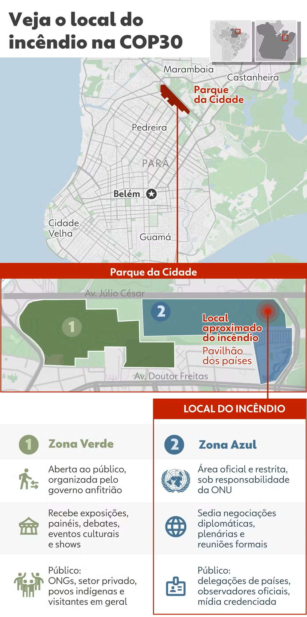 Um incêndio foi registrado nesta quinta-feira (20) em um dos pavilhões onde ocorre a Conferência do Clima, a COP30, em Belém (PA). Os primeiros relatos do problema aconteceram pouco depois das 14h. Pessoas que estavam no local foram retiradas por ordem da segurança. Até por volta das 14h20, não havia detalhes sobre a origem do fogo. O ministro do turismo, Celso Sabino, disse por volta das 14h30 que o incêndio foi controlado. As chamas atingiram espaços na Zona Azul, na área chamada de Pavilhão dos Países. Todas as pessoas que estavam na Zona Azul receberam ordem da segurança para deixar o espaço. A medida significa a paralisação dos trabalhos da COP30. A UNFCCC, entidade da Organização das Nações Unidas responsável pelo evento, informou que os bombeiros realizavam uma checagem de segurança e NÃO há previsão de reabertura da Zona Azul antes das 20h. A Zona Azul, também chamada de Blue Zone, é o principal espaço da Conferência do Clima. Ela é a área onde estão as salas onde se reúnem os negociadores e ministros. Também é o espaço onde países montam seus stands para divulgar projetos e iniciativas. Foi nesta região que o fogo foi registrado (veja o mapa abaixo). O governador do Pará, Helder Barbalho, informou para a jornalista Andréia Sadi que as equipes trabalham com duas hipóteses iniciais para o incidente na COP30: falha em um gerador ou um curto-circuito em um stand. Críticas da ONU à estrutura em Belém Há uma semana, a Organização das Nações Unidas (ONU) cobrou ao governo brasileiro uma reação rápida para solucionar falhas de segurança e problemas estruturais. A demanda foi feita em uma carta enviada pela Convenção-Quadro das Nações Unidas sobre a Mudança do Clima (UNFCCC) a Rui Costa, ministro da Casa Civil (que coordena as atividades relacionadas à cúpula), e a André Corrêa do Lago, presidente da conferência. No documento, o secretário-executivo Simon Stiell relata que a tentativa de invasão ocorrida na noite de terça-feira, quando um grupo estimado em 150 ativistas entrou no pavilhão, deixou feridos, causou danos e expôs "brechas graves" no controle do evento. O texto descreve ainda uma série de vulnerabilidades, entre elas estavam: portas sem monitoramento, contingente de segurança abaixo do necessário e ausência de garantias de resposta rápida das forças federais e estaduais. A ONU também chamou atenção para problemas de infraestrutura: calor excessivo em pavilhões, falhas de climatização, infiltrações provocadas pelas chuvas e riscos associados a água próxima de instalações elétricas. O que é o Pavilhão dos Países? O pavilhão dos países é a área da COP30 dedicada às exposições oficiais das delegações nacionais e de organizações internacionais. Localizado na entrada da Blue Zone, o espaço reúne estandes onde são realizados debates, mesas temáticas e apresentações de projetos ligados à agenda climática. Ali não atuam os negociadores formais dos países, mas sim observadores, representantes técnicos e instituições parceiras. Além dos governos, também estão presentes organizações como a ONU e a OTCA. Esses pavilhões funcionam como vitrines para que cada país apresente suas estratégias, soluções e iniciativas, servindo de palco para painéis, encontros bilaterais e atividades paralelas relacionadas às negociações climáticas.