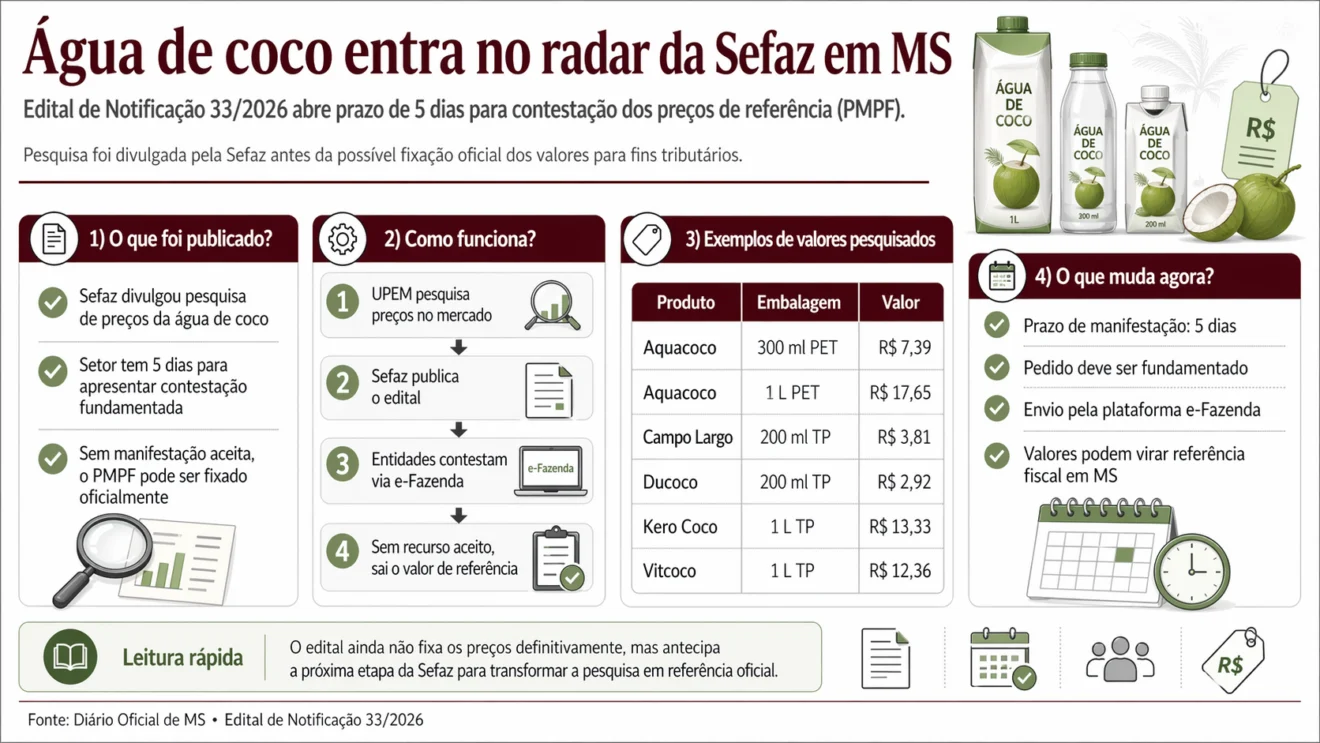 A Secretaria de Estado de Fazenda de Mato Grosso do Sul abriu prazo para que entidades do setor contestem os preços pesquisados da água de coco em Mato Grosso do Sul, conforme o Edital de Notificação nº 33/2026 publicado no Diário Oficial desta sexta-feira.