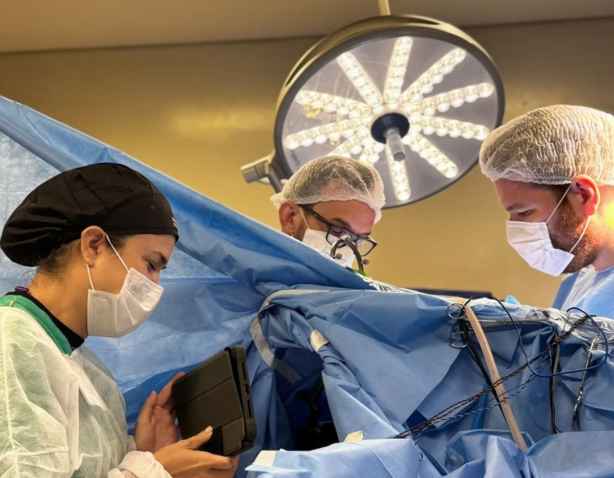 Além disso, a neurofisiologista Nathalia Cristaldo monitora continuamente as funções neurológicas por meio de exames como potenciais evocados e eletromiografia, fornecendo feedback em tempo real à equipe cirúrgica.